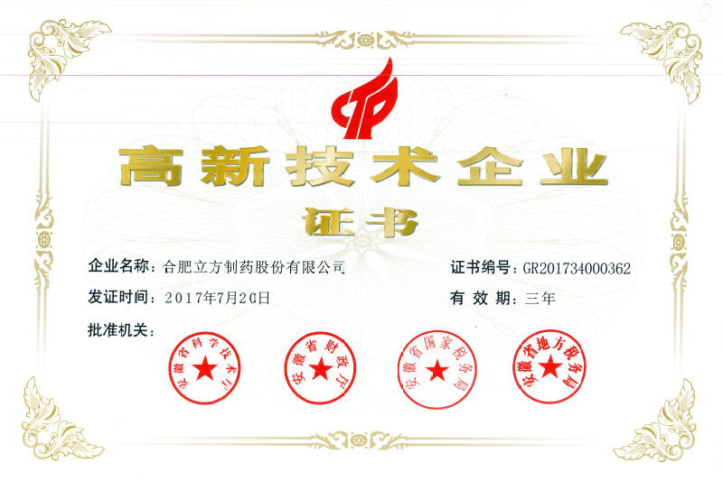 合肥立方制藥股份有限公司科學(xué)技術(shù)一等獎(jiǎng)