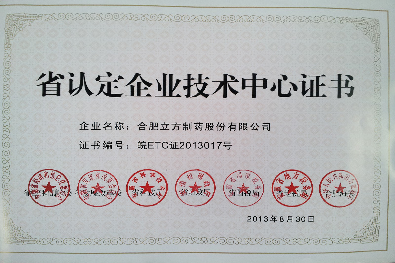 立方制藥 省認(rèn)定企業(yè)技術(shù)中心 證書(shū)